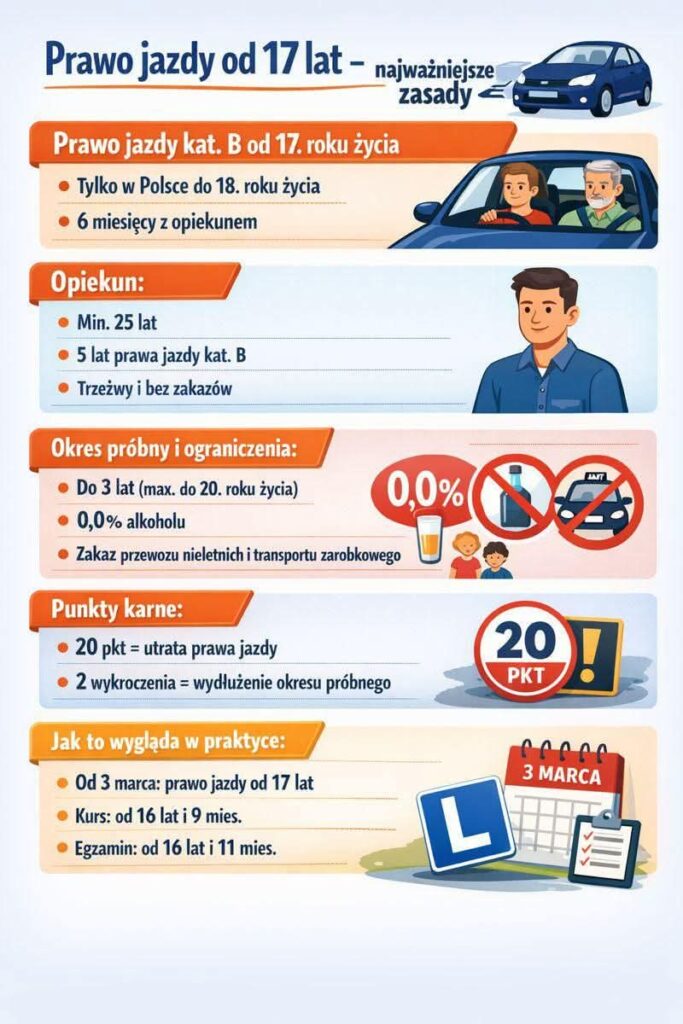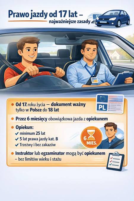 - pisemna zgoda rodzica lub opiekuna prawnegoPo uzyskaniu prawa jazdy 17-letni nowy kierowca przez 6 miesięcy (ale nie dłużej niż do ukończenia 18 lat) ma obowiązek prowadzenia pojazdu pod nadzorem opiekuna.